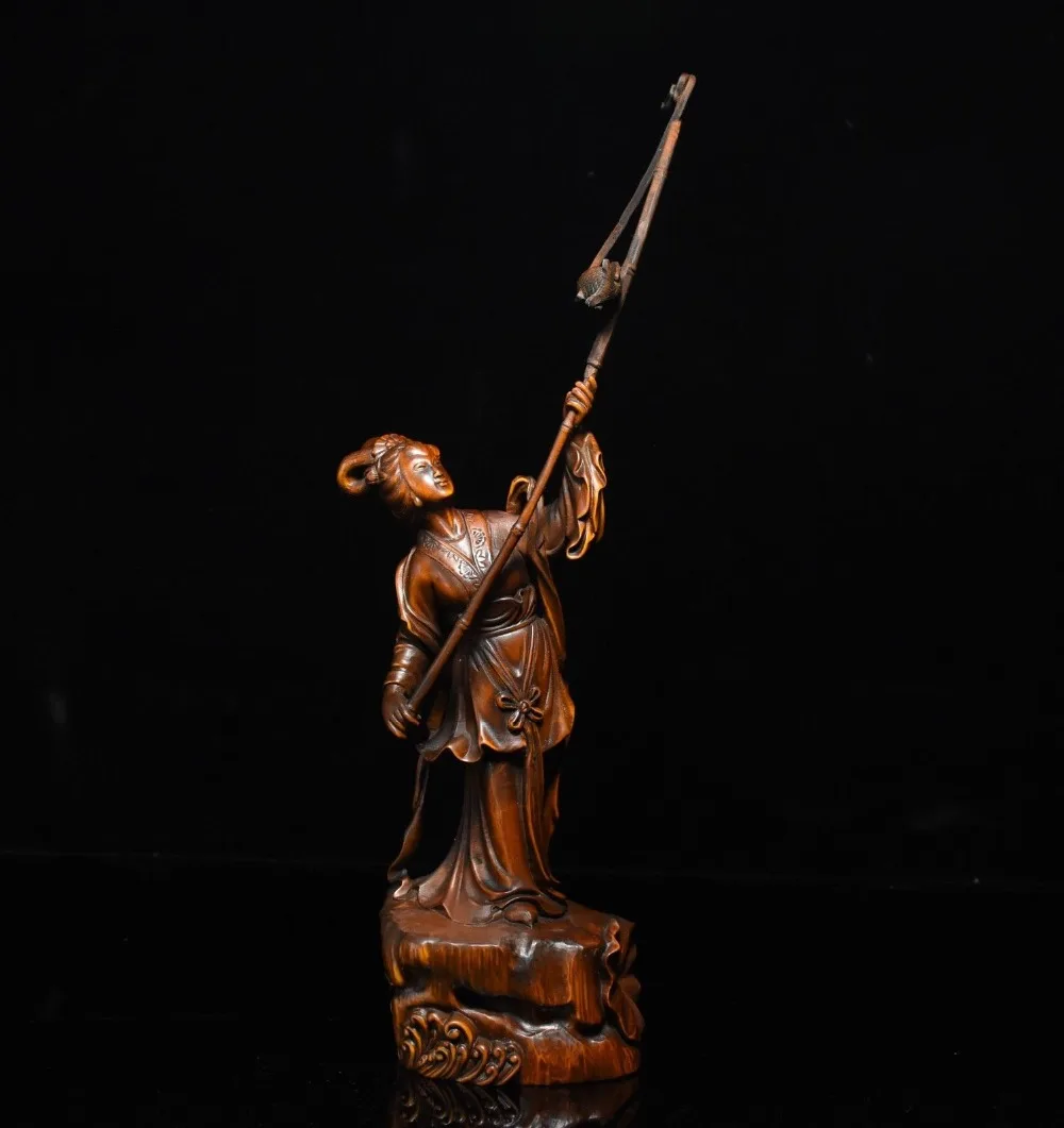 Promo christmas 12" Folk Collect Boxwood wood Carve beautiful woman girl goddess fishing Statue halloween